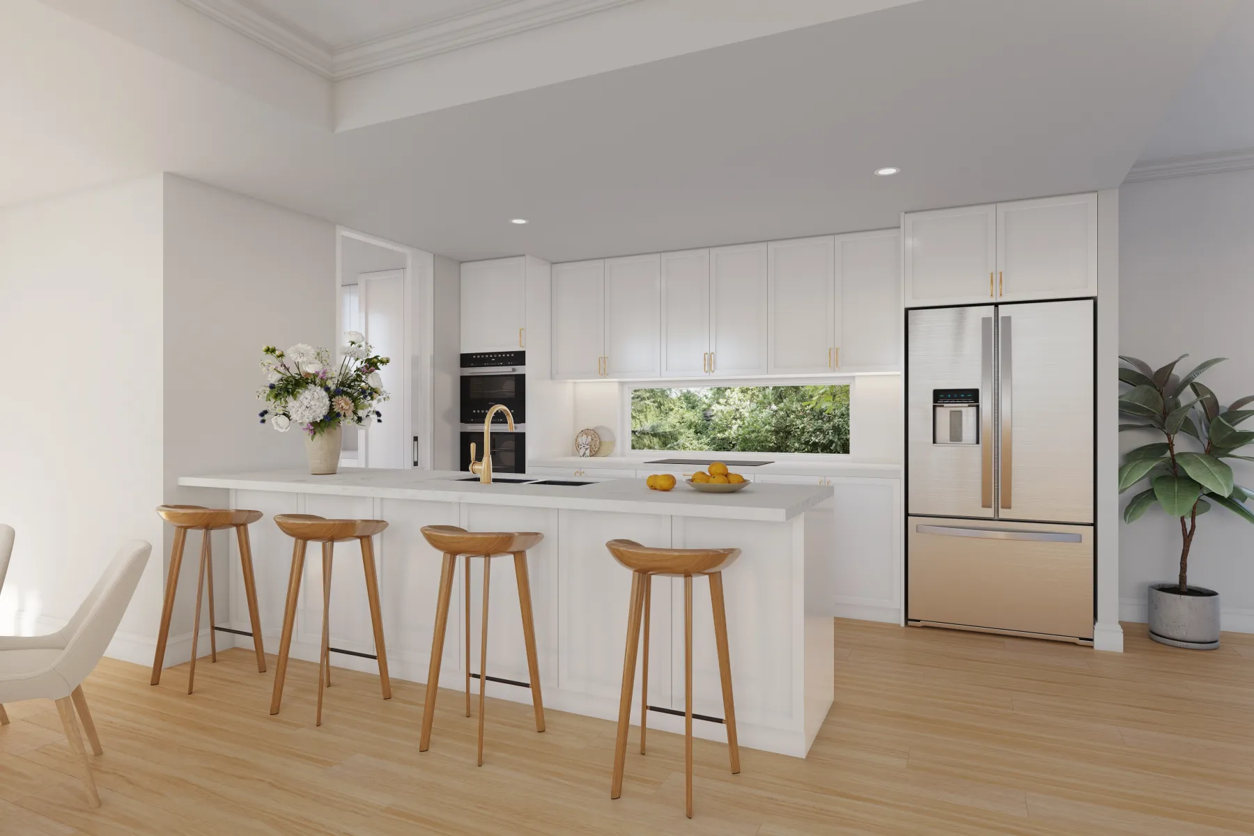 – Designer kitchen with 40mm stone benchtops, European Miele appliances, gas cooktop, breakfast bar, and integrated dishwasher